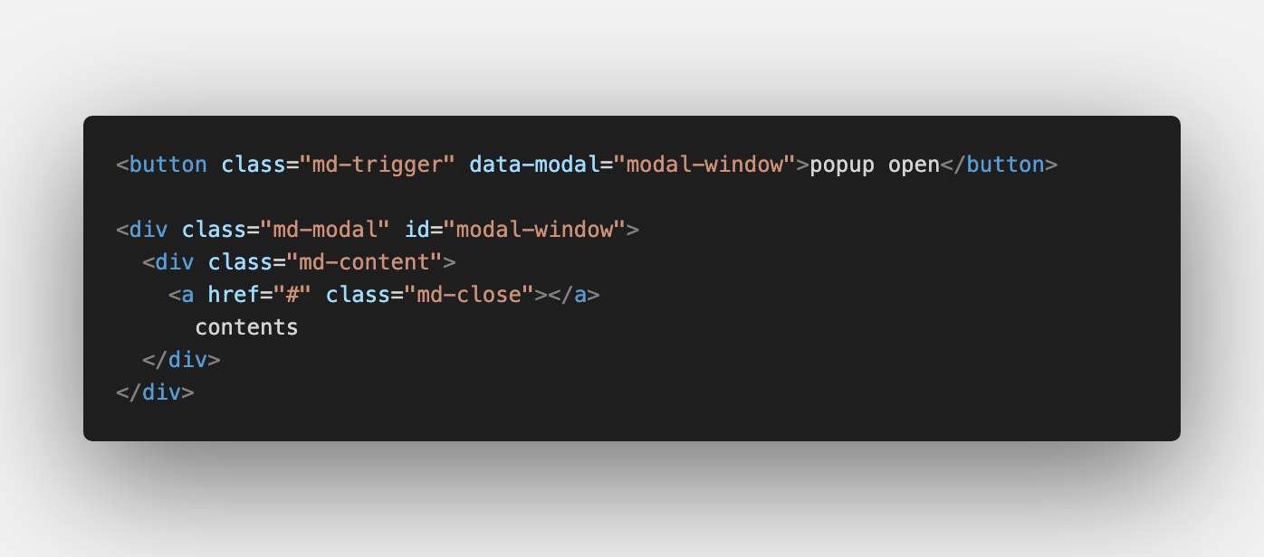 기본적으로 호출하는 쪽의 data-modal 값과 호출된 창의 id값이 동일해야 하며 호출하는 쪽에서는 md-trigger라는 class가, 호출된 쪽에서는 창을 닫기 위한 md-close가 필수로 존재해야 함.
